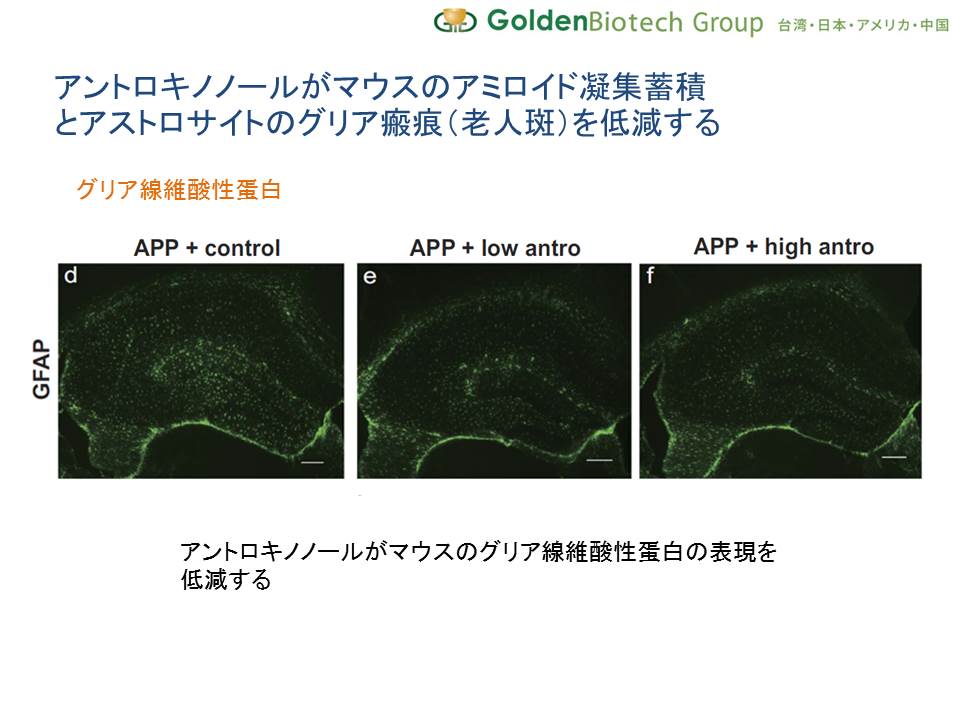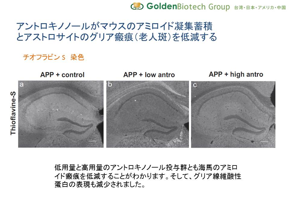 GoldenBiotechは、陽明大学の脳科学研究所の鄭菡若(てい かんじゃく)准教授と提携して共同開発したアルツハイマー認知症を予防する研究に関する研究の結果「アントロキノノールは、アルツハイマー型認知症を惹起するアミロイドβ蛋白の凝集蓄積を改善し、空間認知、学習能力、記憶力を改善する」を世界中の権威的な学術誌Nature(ネイチャー)の関連誌であるScientific Reportsにて公表しました。