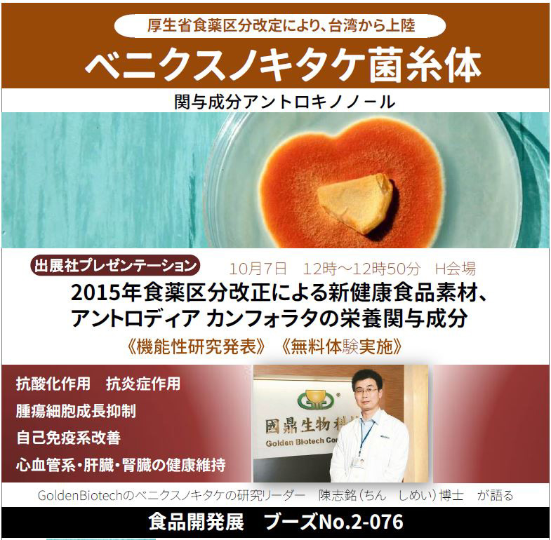 今年4月1日、厚生省の食薬区分の改正により新機能性素材ベニクスノキタケ菌糸体が食品として認定されました。ベニクスノキタケを商業化、活用する最短ルートを知りたい方は、是非ご参加ください。 出展情報及びプレゼンテーションは下記のとおりです。