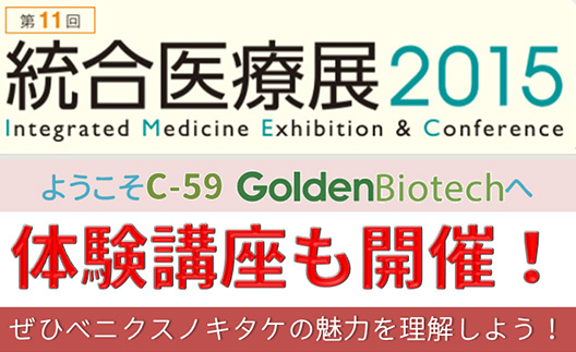 1月28日、29日に東京ビッグサイトで開催される統合医療展2015において、弊社ブースにおいて体験講座「テーマ:GDベニクスノキタケとそのエキス」を実施いたします。
